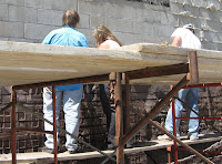 Monday, May 4, 2009 - Mortar was flying so fast today Mara could hardly keep up! Bob Schrieber, who has worked with both Dave and Brian on other jobs, was recruited to help. Bob was thrilled to be able to lay a couple of bricks. Bob says he "... may not be as fast as I was in my younger days," but he still enjoys working with the guys and seeing the finished product. Onlookers were wondering how he could still move after being down on his knees for so long.
